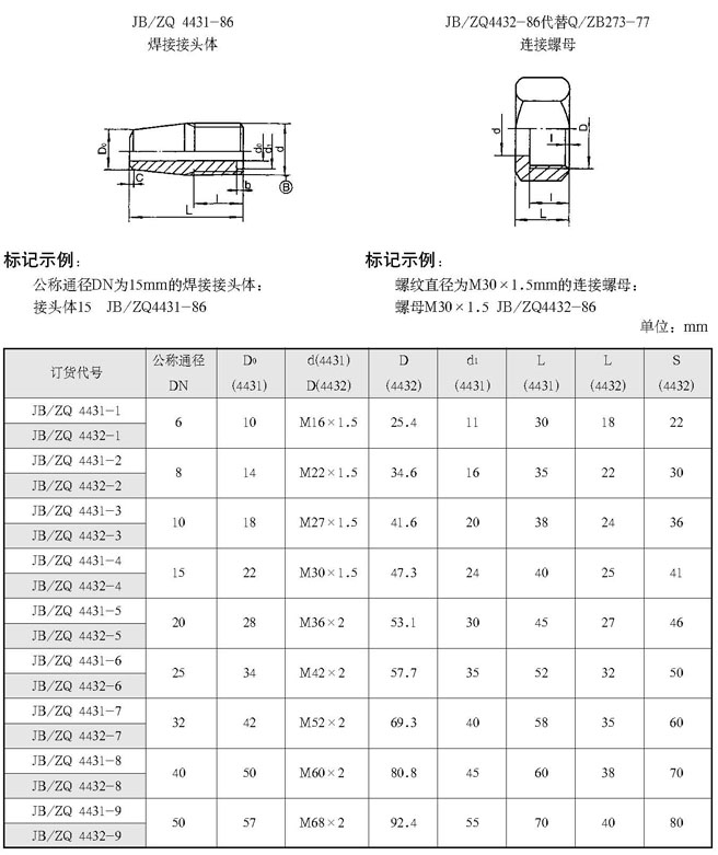 焊接接头体、连接螺母(根据JB/ZQ4431-86、JB/ZQ4432-86 代替Q/ZB273-77)
