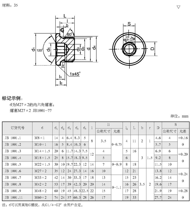 内六角螺塞(根据JB 1001-77)