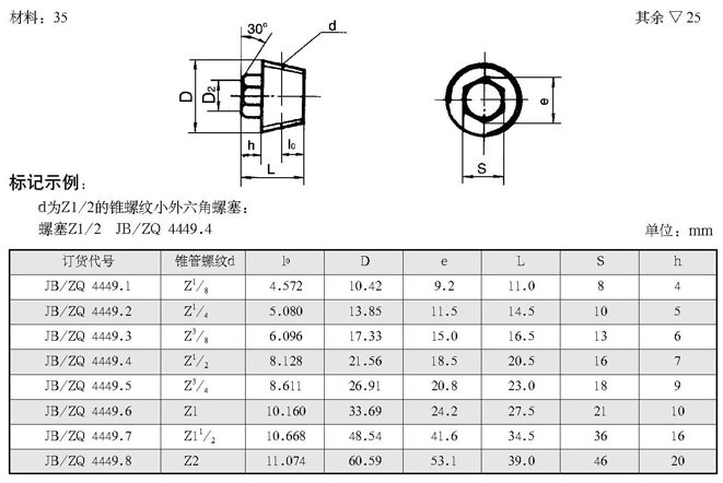 锥螺纹小外六角螺塞(根据JB/ZQ4449-86 代替Q/ZB287-77)