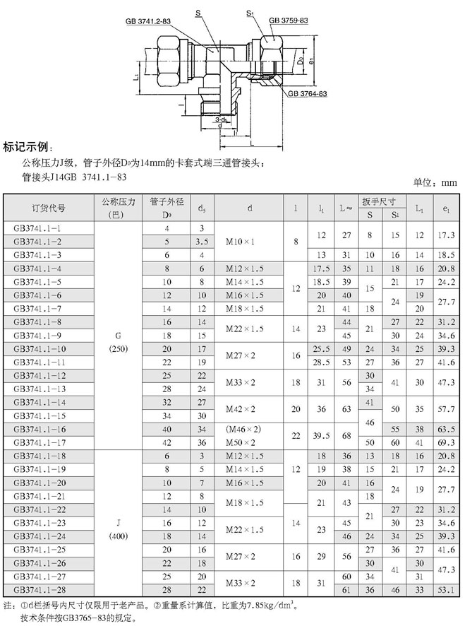 卡套式端三通管接头(根据GB 3741.1-83)