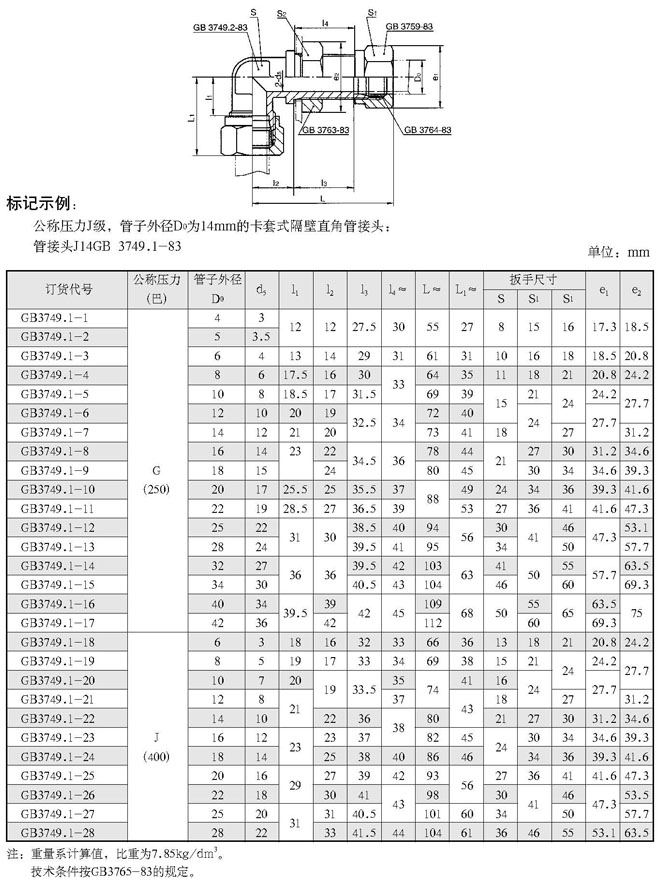 卡套式隔壁直角管接头(根据GB 3749.1-83)