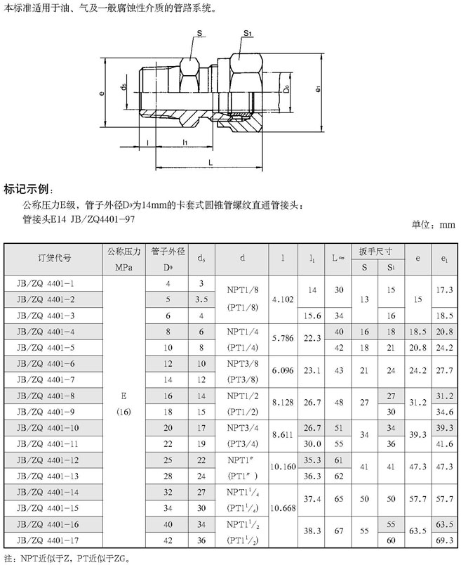卡套式圆锥管螺纹直通管接头(根据JB/ZQ4401-97 代替JB/ZQ4401-86)