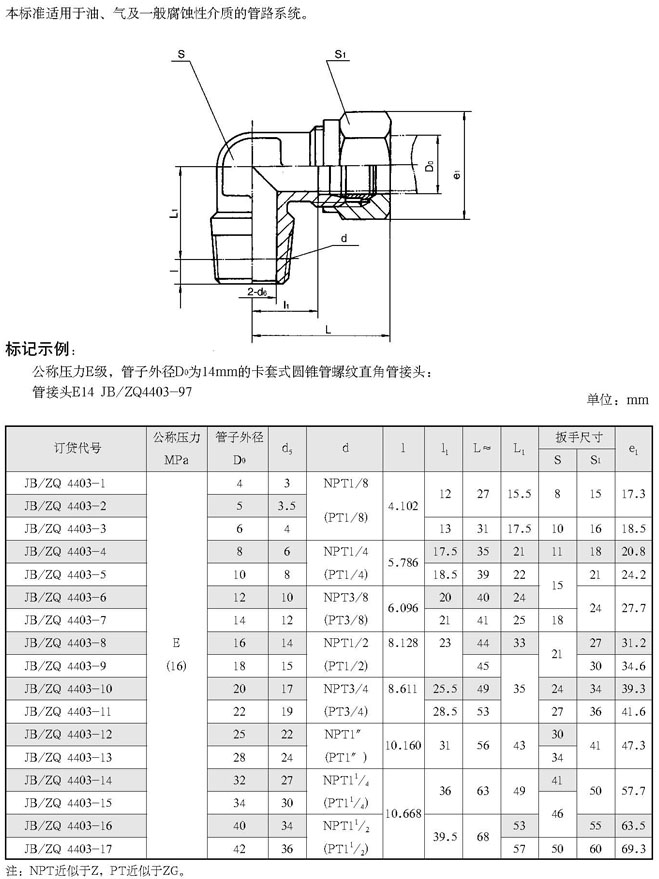 卡套式圆锥管螺纹直角管接头(根据JB/ZQ4403-97 代替JB/ZQ4403-86)