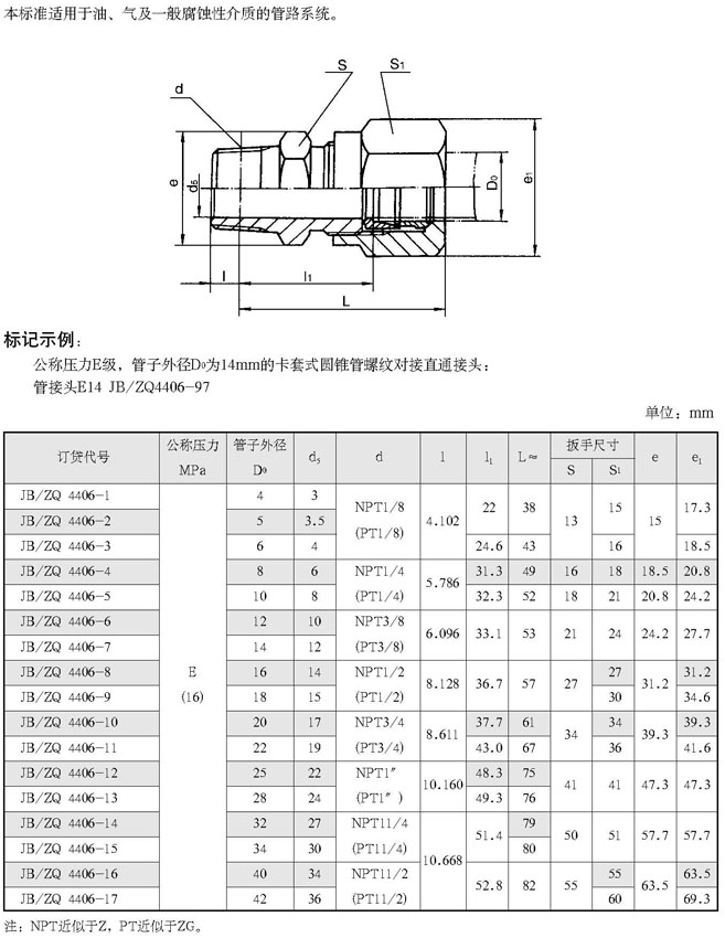 卡套式圆锥管螺纹对接直通管接头(根据JB/ZQ4406-97 代替JB/ZQ4406-86)