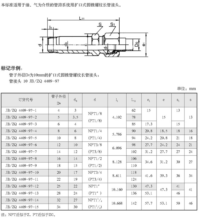 扩口式圆锥管螺纹长管接头(根据JB/ZQ4409-97 代替JB/ZQ4409-86)