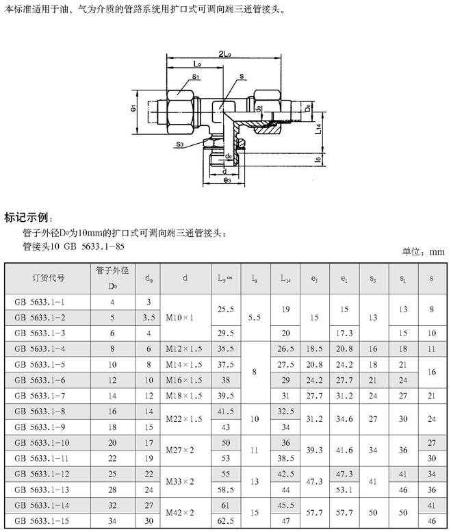 扩口式可调向端三通管接头(根据GB 5633.1-85)