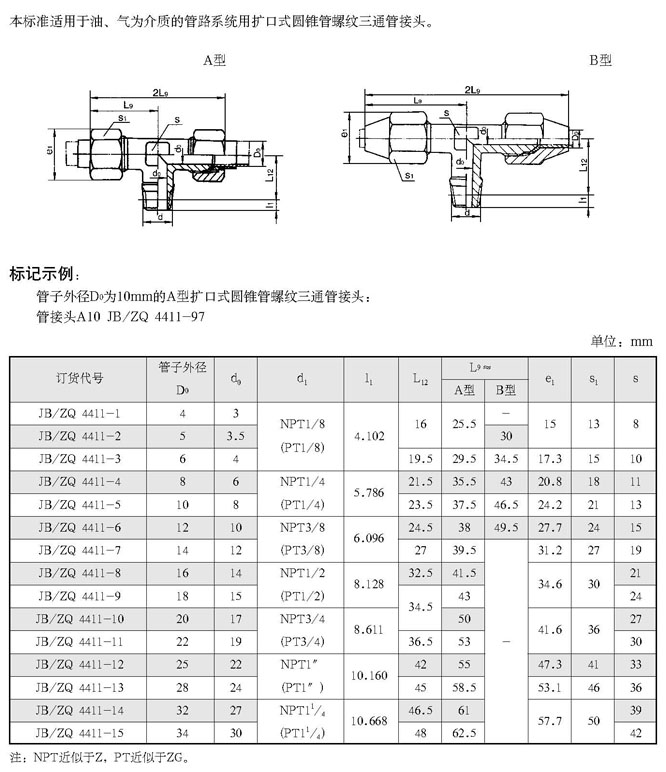扩口式圆锥管螺纹三通管接头(根据JB/ZQ4411-97 代替JB/ZQ4411-86)