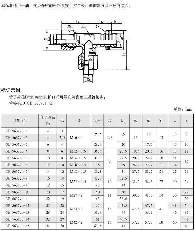 扩口式可调向端直角三通管接头(根据GB 5637.1-85)