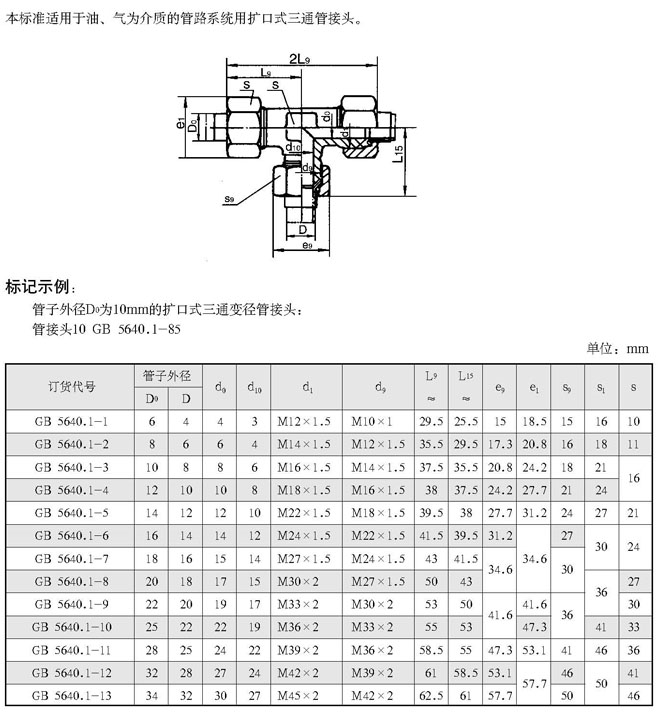 扩口式三通变径管接头(根据GB 5640.1-85)