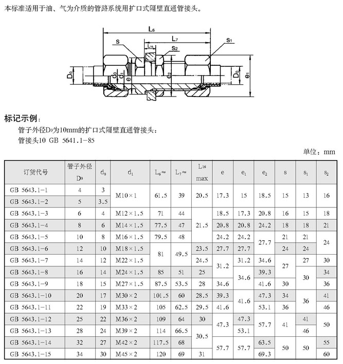 扩口式隔壁直通管接头(根据GB 5643.1-85)