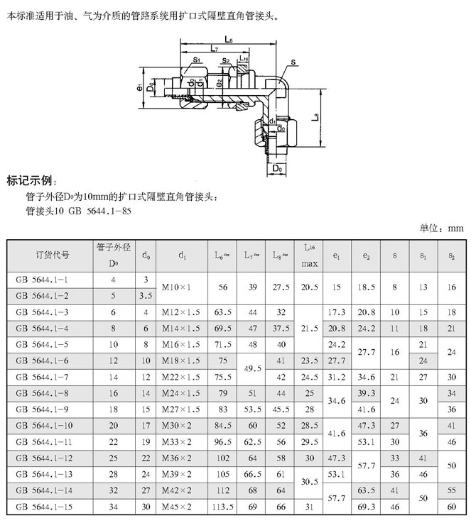 扩口式隔壁直角管接头(根据GB 5644.1-85)