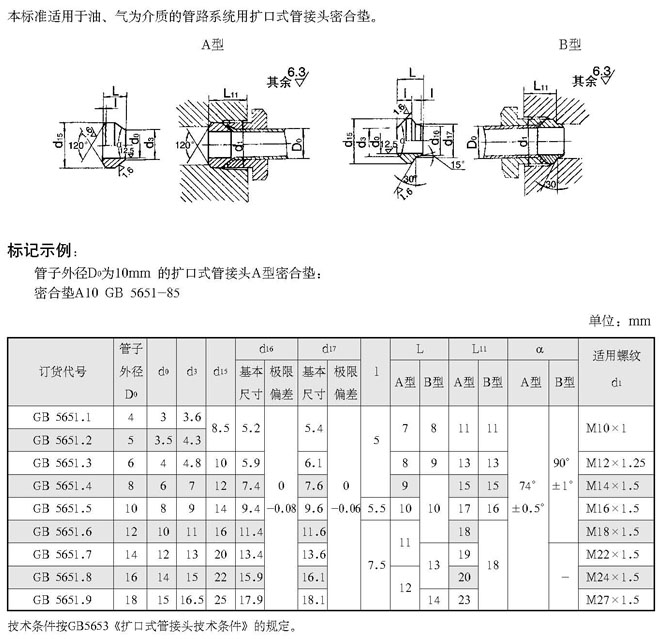 扩口式管接头密合垫(根据GB 5651.1-85)